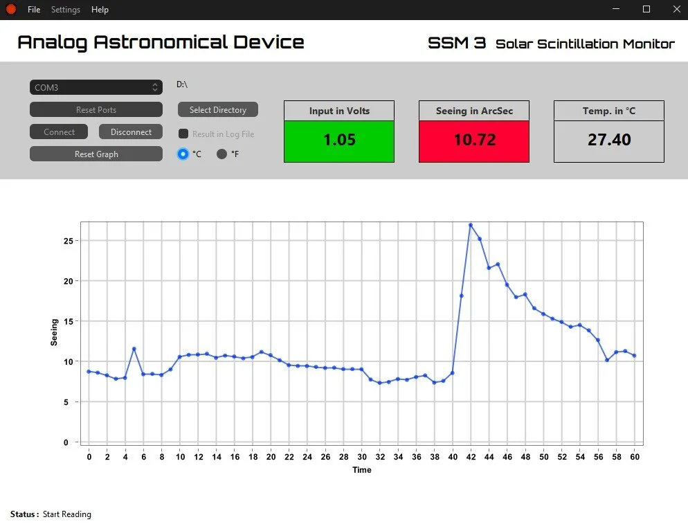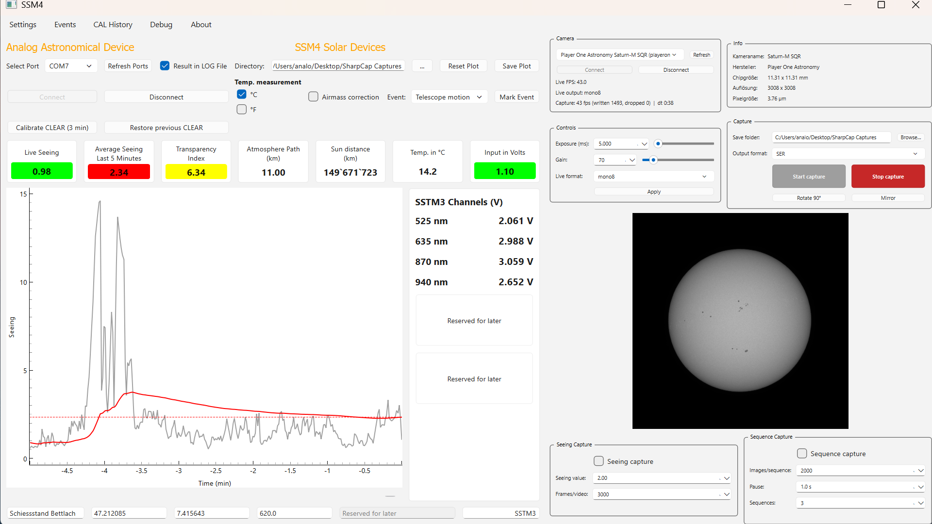 The SSM3 is primarily used for live solar observing. It measures near-ground atmospheric turbulence, known as seeing, which is expressed in arcseconds. This allows the observer to monitor the current seeing at any time and decide when it is best to capture photos or videos.